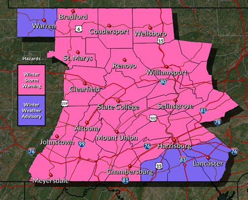 Snow squalls expected to sweep across region | News ... National Weather Service State College A wind advisory will be in effect from 9 a.m. to 7 p.m. today. Steady winds of 15-25 mph are expected with gusts of 45-50 mph mixed in.